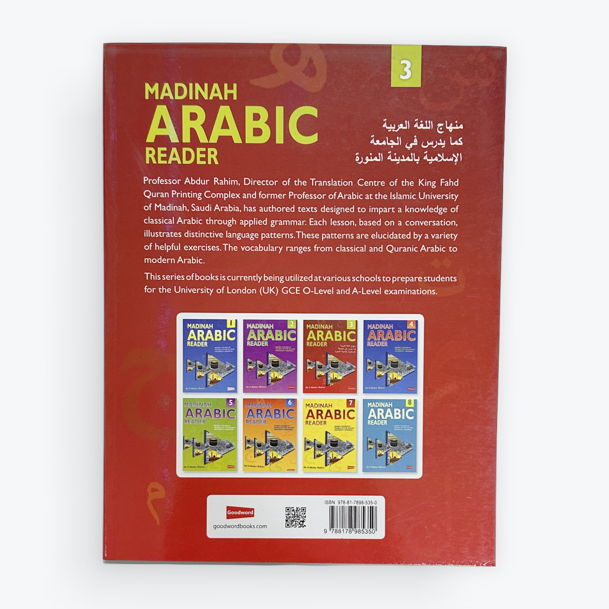 Director of the Translation Centre at the King Fahd Quran Printing Complex and former Arabic professor at the Islamic University of Madinah, Saudi Arabia, Professor Abdur Rahim has authored an eight-volume series. These texts are designed to equip students with a comprehensive understanding of classical Arabic structure. Emphasizing applied grammar, each book guides learners through essential language skills. The lessons, rooted in conversations, showcase distinct language patterns. Through diverse exercises, students grasp and master the patterns introduced in each lesson. The vocabulary spans classical and Quranic Arabic, extending to contemporary expressions in modern Arabic. Widely adopted in schools, this series prepares students for the University of London (UK) GCE O-Level and A-Level examinations.